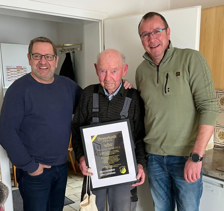 Bei Streuselkuchen und einem Gläschen Grappa haben die beiden die Ehrenurkunde über 80 Jahre Mitgliedschaft an Heiner Rüsenberg überreicht. Heiner ist demnach das Vereinsmitglied mit der längsten Zugehörigkeit.